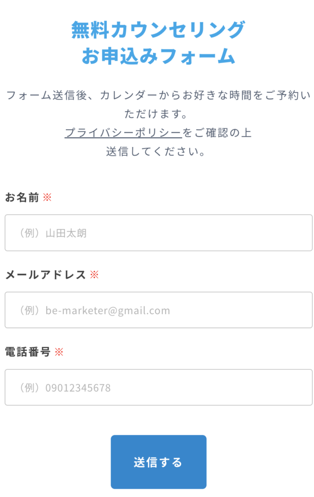 申し込みフォームより名前、メールアドレス、電話番号を入力