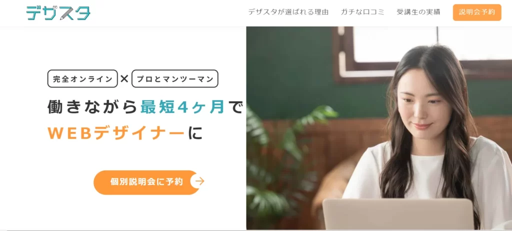 デザスタでは完全未経験者からでもWebデザイナーを目指せるカリキュラムやマンツーマン指導による徹底的なサポートがあります。