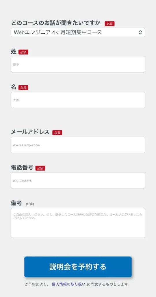 最後に氏名・メールアドレス・電話番号などの必要事項を記入して「説明会を予約する」をタップすれば予約完了です。