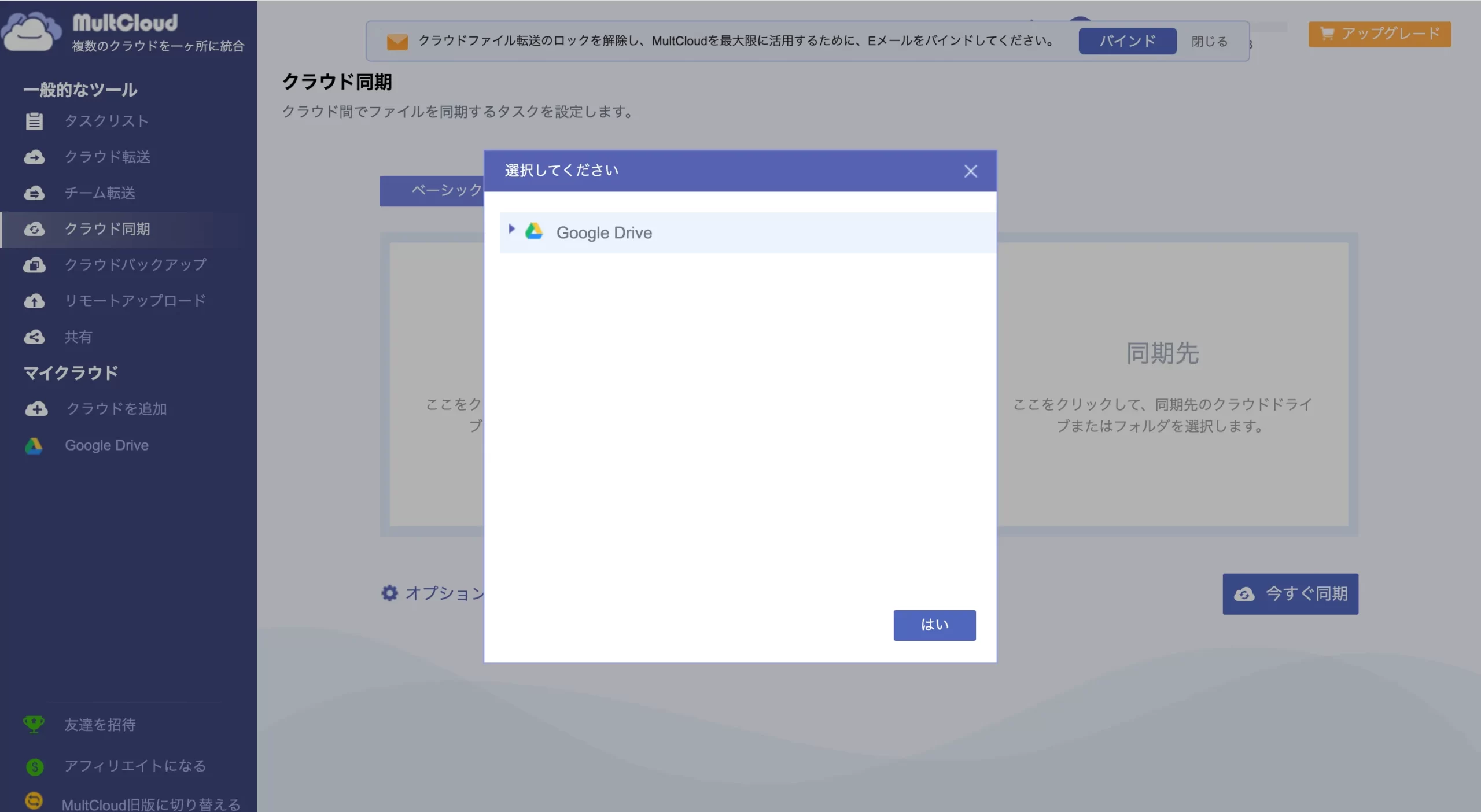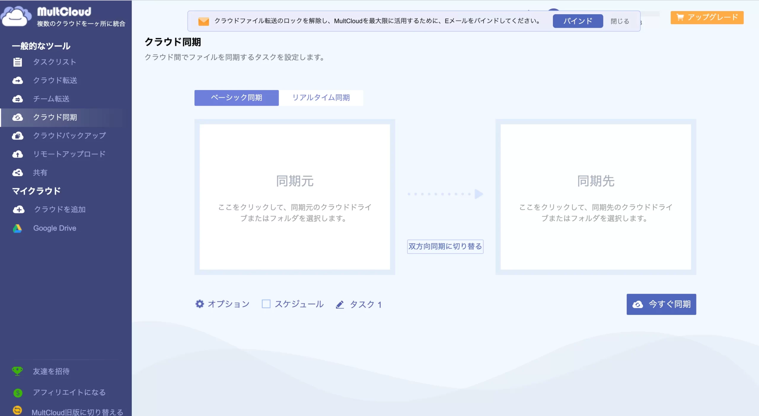 同期元・同期先は追加したクラウドから任意で選択できます。