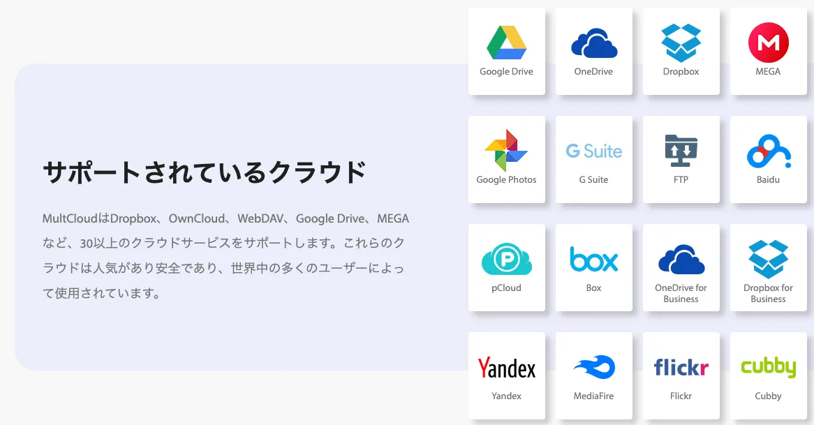 MultCloudで使用可能なクラウドは30以上もあるので、あらゆる国のユーザーに対応できるでしょう。