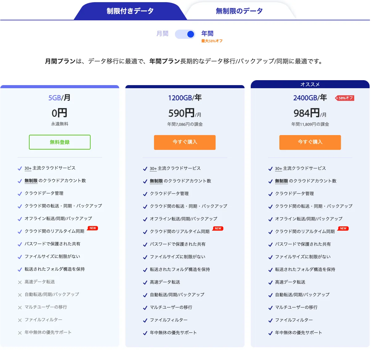 MultCloudの料金プランは制限付きデータと無制限のデータに分かれます。