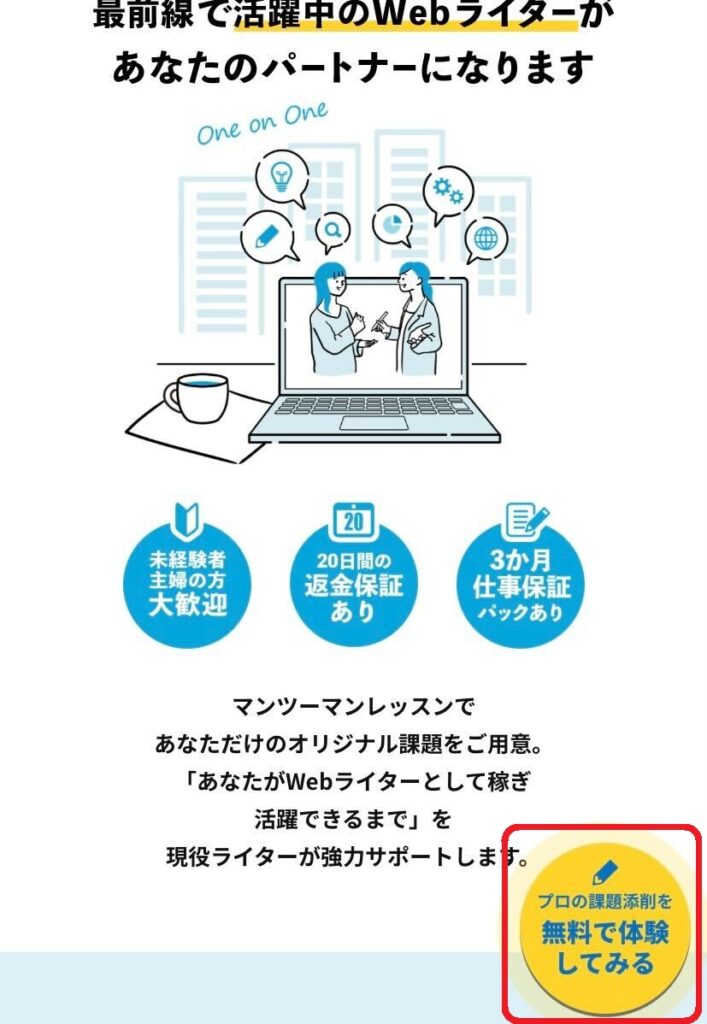 まず公式サイトにアクセスして、画面右下の『プロの課題添削を無料で体験してみる』をタップします。