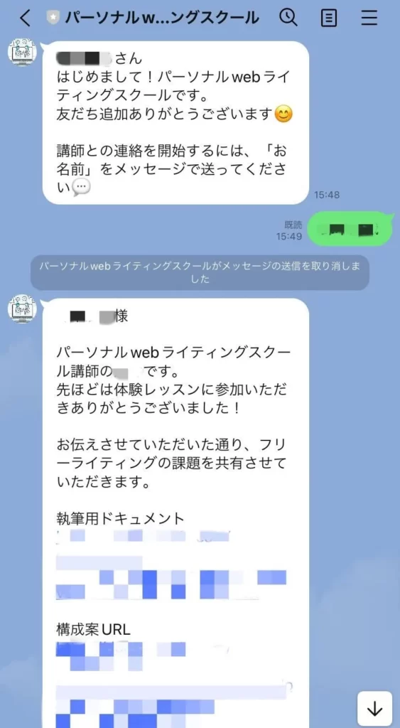 カウンセリングがひと通り終わると、Google Meetで共有された公式LINEで「学びたい内容」に即したフリーライティングの課題が用意されます。