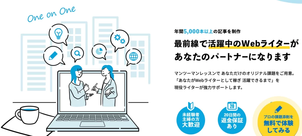 マンツーマン指導かつ24時間のチャットサポート対応で、ライフスタイルに合わせて効率的にライティングスキルを向上できるスクールです。
