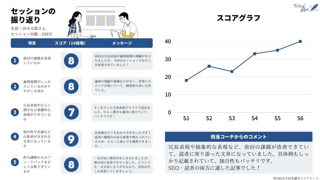 受講生専用のスコアシートでは抱えている課題やスキルなどの成長ぶりを数値化するので、より効率的に学習できるでしょう。